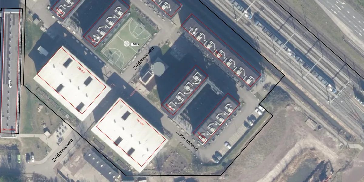 Het perceel waarop Zuiderzeeweg 82-D staat heeft een oppervlakte van 1,5 ha. Dit is een zeer groot perceel. De perceeloppervlakte wordt geregistreerd door het Kadaster. Gedetailleerde informatie over de maten van dit perceel kunt u vinden in het rapport Kadastrale kaart met maatvoering van Zuiderzeeweg 82-D.