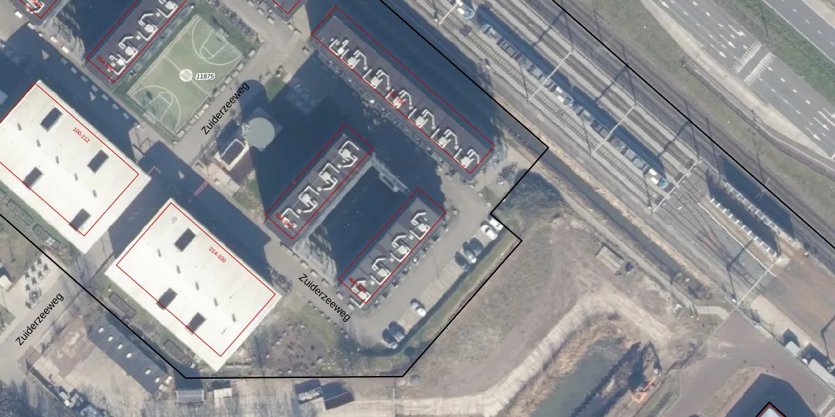 Het perceel waarop Zuiderzeeweg 86-N staat heeft een oppervlakte van 1,5 ha. Dit is een zeer groot perceel. De perceeloppervlakte wordt geregistreerd door het Kadaster. Gedetailleerde informatie over de maten van dit perceel kunt u vinden in het rapport Kadastrale kaart met maatvoering van Zuiderzeeweg 86-N.
