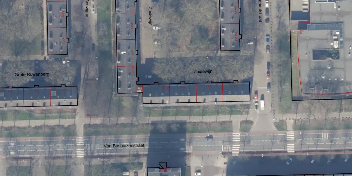 Het perceel waarop Zuidewijn 12 staat heeft een oppervlakte van 1361 m². Dit is een zeer groot perceel. De perceeloppervlakte wordt geregistreerd door het Kadaster. Gedetailleerde informatie over de maten van dit perceel kunt u vinden in het rapport Kadastrale kaart met maatvoering van Zuidewijn 12.