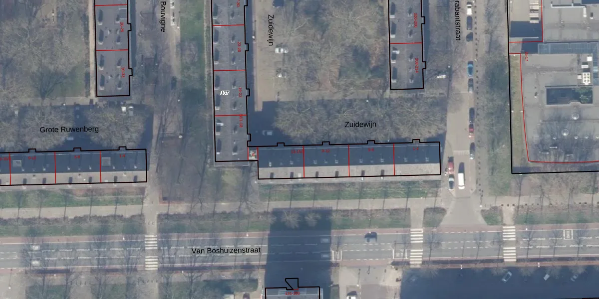 Het perceel waarop Zuidewijn 13 staat heeft een oppervlakte van 1361 m². Dit is een zeer groot perceel. De perceeloppervlakte wordt geregistreerd door het Kadaster. Gedetailleerde informatie over de maten van dit perceel kunt u vinden in het rapport Kadastrale kaart met maatvoering van Zuidewijn 13.