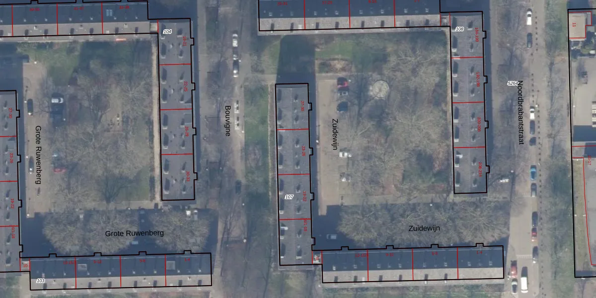 Het perceel waarop Zuidewijn 25-1 staat heeft een oppervlakte van 1361 m². Dit is een zeer groot perceel. De perceeloppervlakte wordt geregistreerd door het Kadaster. Gedetailleerde informatie over de maten van dit perceel kunt u vinden in het rapport Kadastrale kaart met maatvoering van Zuidewijn 25-1.