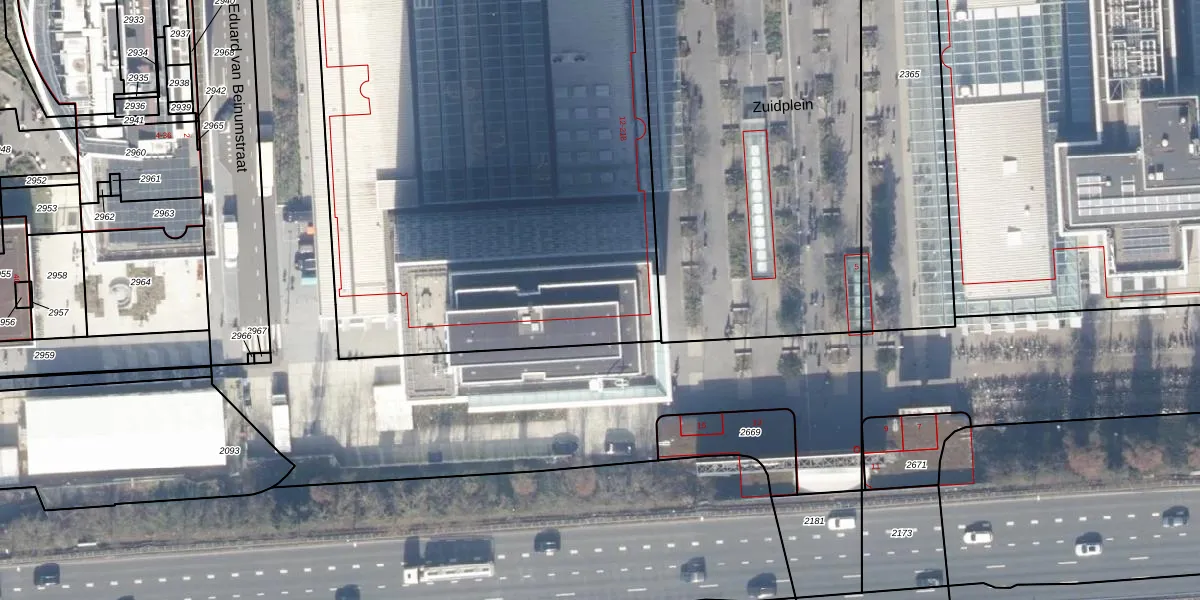 Het perceel waarop Zuidplein 208 staat heeft een oppervlakte van 5300 m². Dit is een zeer groot perceel. De perceeloppervlakte wordt geregistreerd door het Kadaster. Gedetailleerde informatie over de maten van dit perceel kunt u vinden in het rapport Kadastrale kaart met maatvoering van Zuidplein 208.