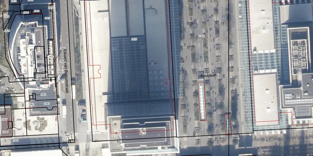 Het perceel waarop Zuidplein 30 staat heeft een oppervlakte van 5300 m². Dit is een zeer groot perceel. De perceeloppervlakte wordt geregistreerd door het Kadaster. Gedetailleerde informatie over de maten van dit perceel kunt u vinden in het rapport Kadastrale kaart met maatvoering van Zuidplein 30.