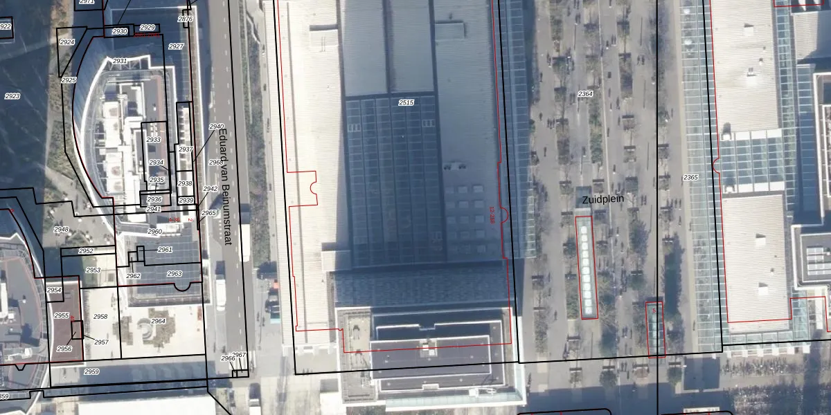 Het perceel waarop Zuidplein 36 staat heeft een oppervlakte van 5300 m². Dit is een zeer groot perceel. De perceeloppervlakte wordt geregistreerd door het Kadaster. Gedetailleerde informatie over de maten van dit perceel kunt u vinden in het rapport Kadastrale kaart met maatvoering van Zuidplein 36.