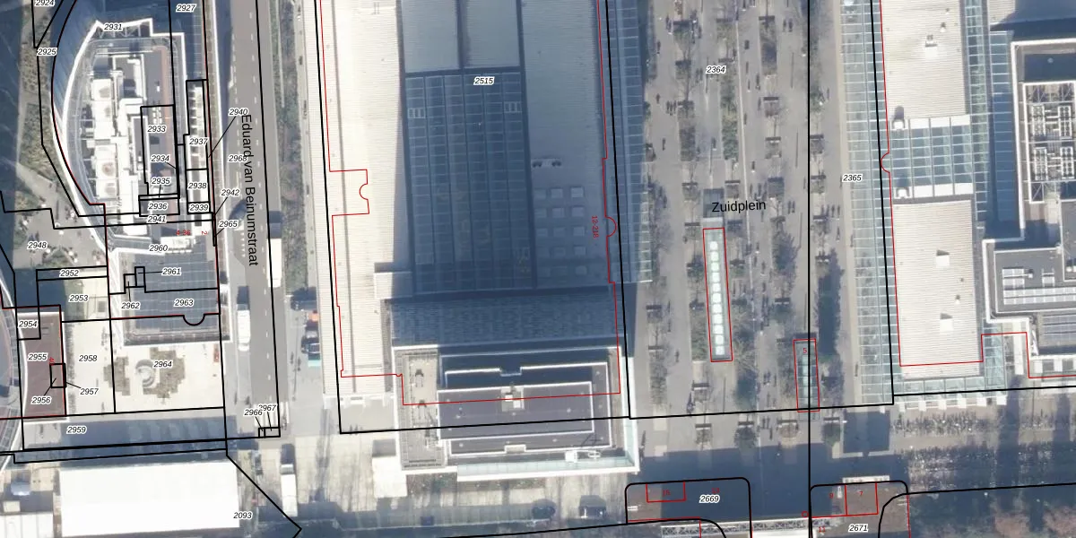 Het perceel waarop Zuidplein 98 staat heeft een oppervlakte van 5300 m². Dit is een zeer groot perceel. De perceeloppervlakte wordt geregistreerd door het Kadaster. Gedetailleerde informatie over de maten van dit perceel kunt u vinden in het rapport Kadastrale kaart met maatvoering van Zuidplein 98.