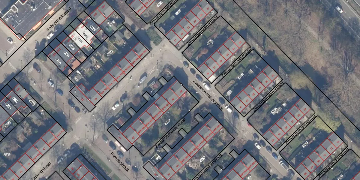 Het perceel waarop Zwaardemakerstraat 38 staat heeft een oppervlakte van 969 m². Dit is een groot perceel. De perceeloppervlakte wordt geregistreerd door het Kadaster. Gedetailleerde informatie over de maten van dit perceel kunt u vinden in het rapport Kadastrale kaart met maatvoering van Zwaardemakerstraat 38.
