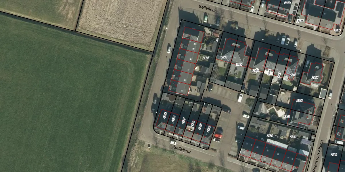 Het perceel waarop Bellefleur 25 staat heeft een oppervlakte van 1075 m². Dit is een zeer groot perceel. De perceeloppervlakte wordt geregistreerd door het Kadaster. Gedetailleerde informatie over de maten van dit perceel kunt u vinden in het rapport Kadastrale kaart met maatvoering van Bellefleur 25.