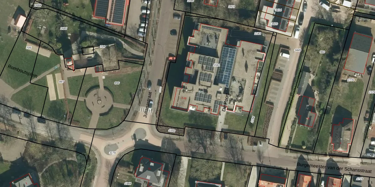 Het perceel waarop De Poort 13 staat heeft een oppervlakte van 2772 m². Dit is een zeer groot perceel. De perceeloppervlakte wordt geregistreerd door het Kadaster. Gedetailleerde informatie over de maten van dit perceel kunt u vinden in het rapport Kadastrale kaart met maatvoering van De Poort 13.