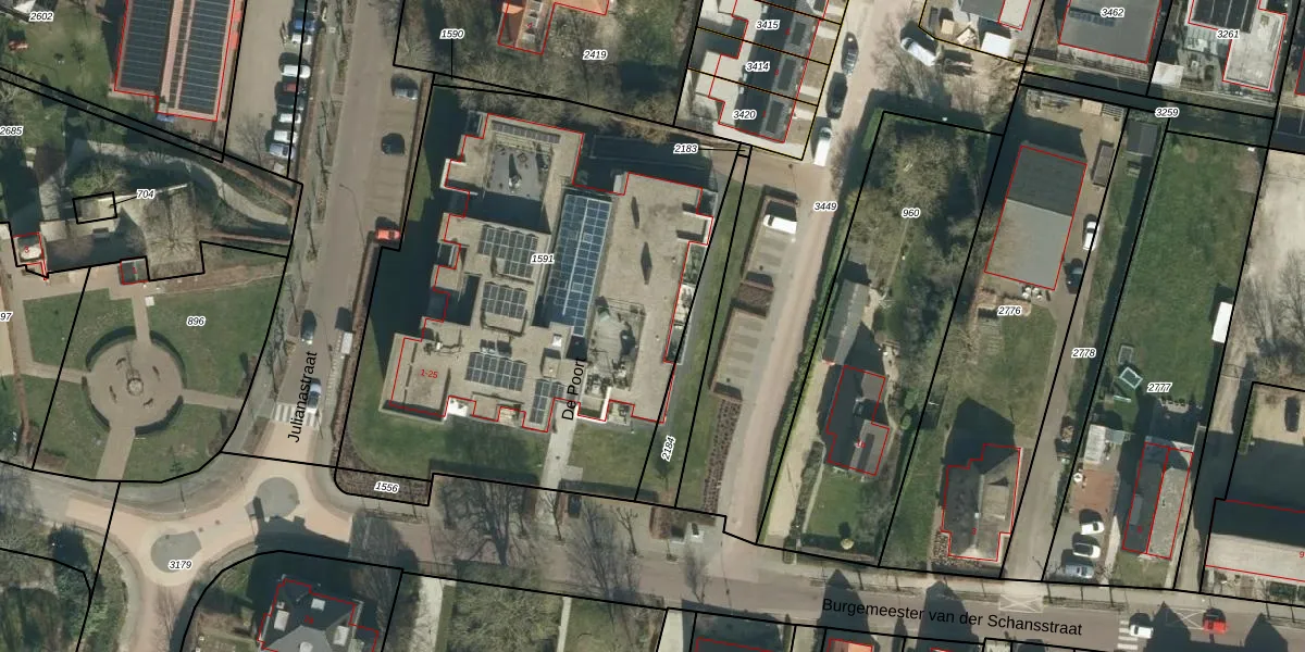 Het perceel waarop De Poort 21 staat heeft een oppervlakte van 2772 m². Dit is een zeer groot perceel. De perceeloppervlakte wordt geregistreerd door het Kadaster. Gedetailleerde informatie over de maten van dit perceel kunt u vinden in het rapport Kadastrale kaart met maatvoering van De Poort 21.