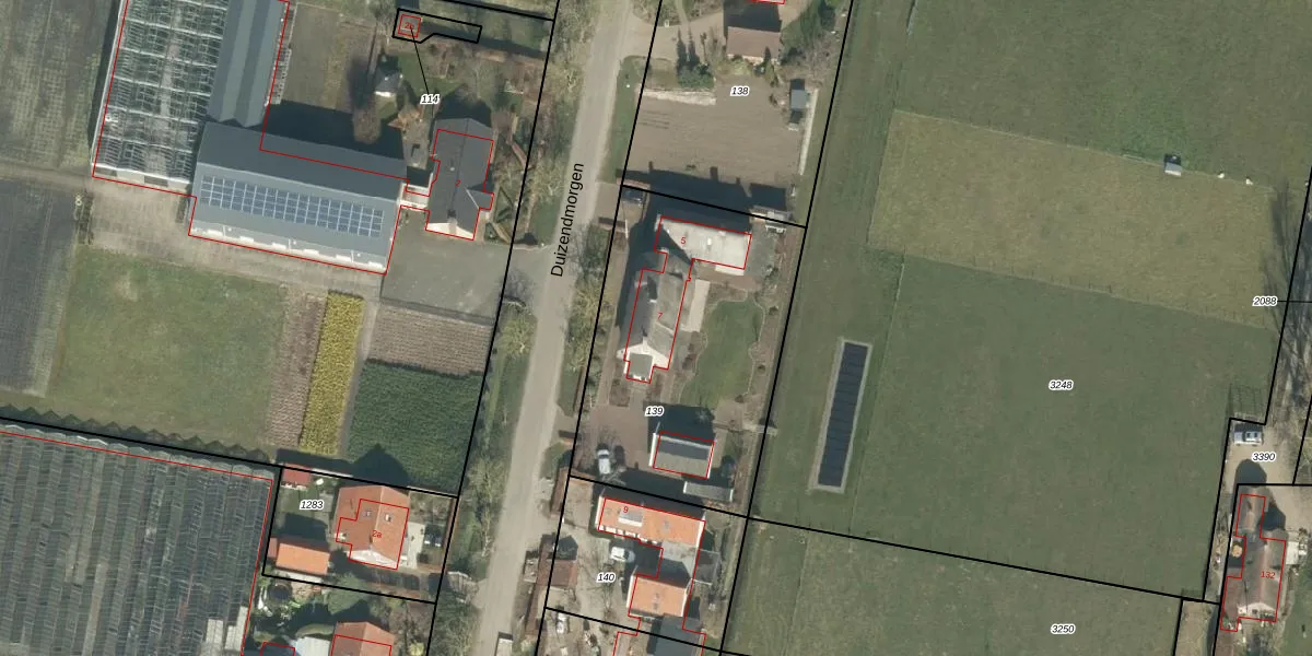 Het perceel waarop Duizendmorgen 7 staat heeft een oppervlakte van 1260 m². Dit is een zeer groot perceel. De perceeloppervlakte wordt geregistreerd door het Kadaster. Gedetailleerde informatie over de maten van dit perceel kunt u vinden in het rapport Kadastrale kaart met maatvoering van Duizendmorgen 7.