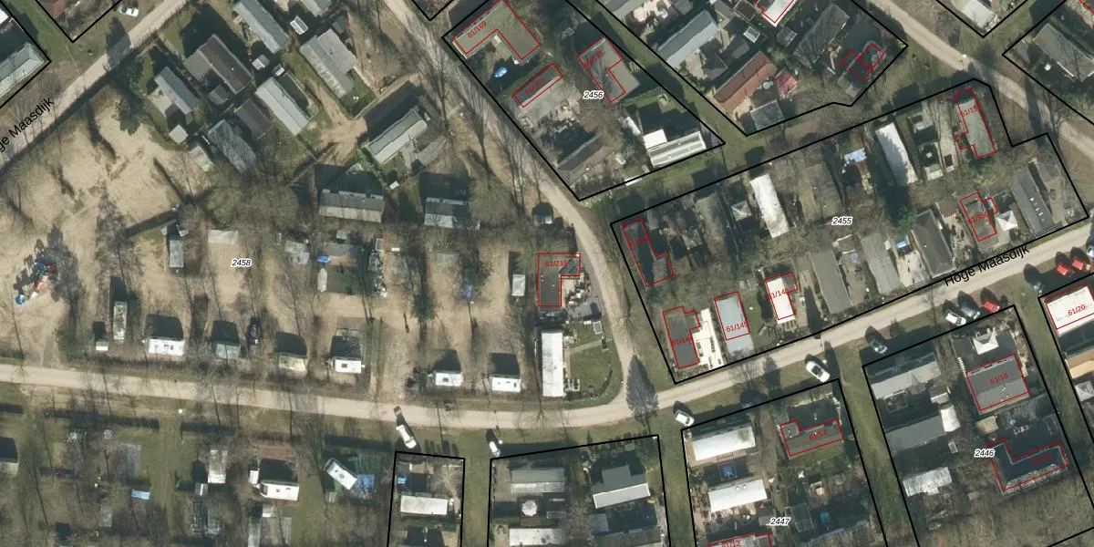 Het perceel waarop Hoge Maasdijk 61-215 staat heeft een oppervlakte van 3,8 ha. Dit is een zeer groot perceel. De perceeloppervlakte wordt geregistreerd door het Kadaster. Gedetailleerde informatie over de maten van dit perceel kunt u vinden in het rapport Kadastrale kaart met maatvoering van Hoge Maasdijk 61-215.