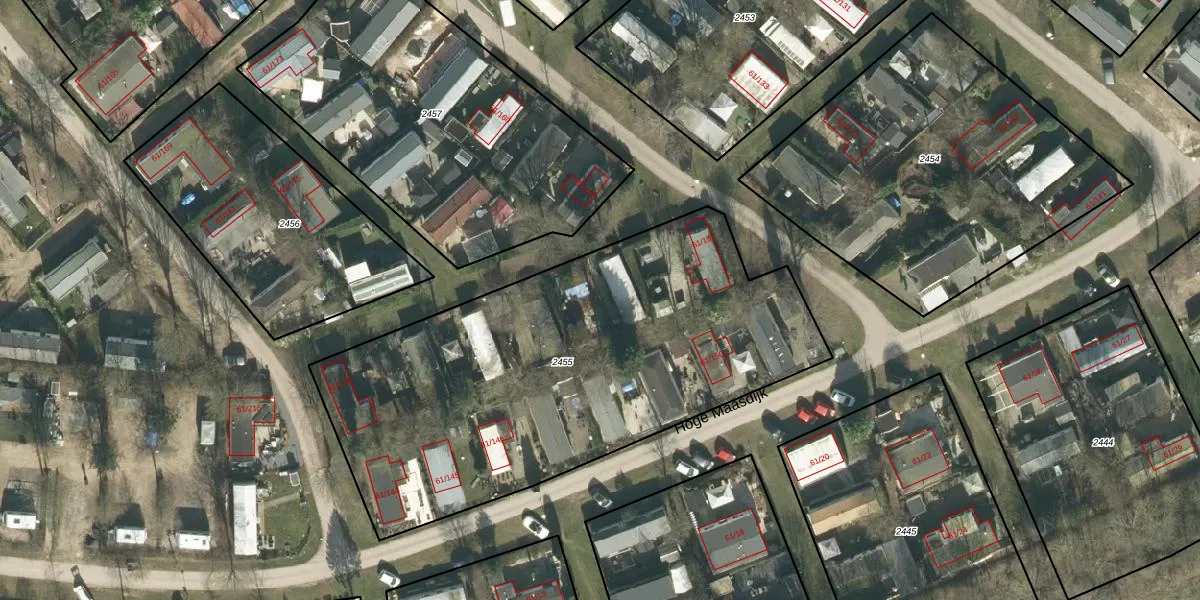Hoge Maasdijk 61-156 is gelegen op kadastraal perceel WDC00I2455. Deze kadastrale aanduiding is uniek en wordt gebruikt door het Kadaster om eigendomsrechten en andere zakelijke rechten vast te leggen. Het perceel maakt onderdeel uit van de kadastrale gemeente Woudrichem.