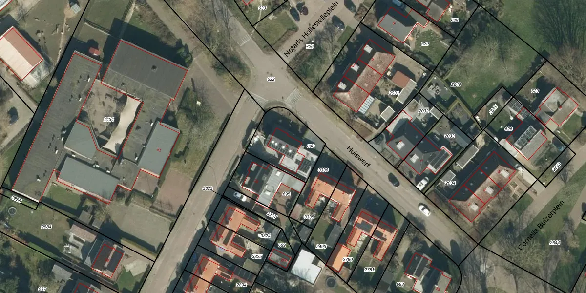 Het perceel waarop Huiswerf 9 staat heeft een oppervlakte van 398 m². Dit is een groot perceel. De perceeloppervlakte wordt geregistreerd door het Kadaster. Gedetailleerde informatie over de maten van dit perceel kunt u vinden in het rapport Kadastrale kaart met maatvoering van Huiswerf 9.