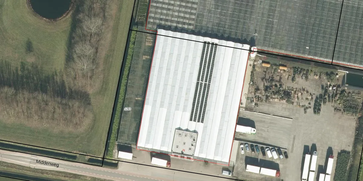 Het perceel waarop Middenweg 21 staat heeft een oppervlakte van 1,0 ha. Dit is een zeer groot perceel. De perceeloppervlakte wordt geregistreerd door het Kadaster. Gedetailleerde informatie over de maten van dit perceel kunt u vinden in het rapport Kadastrale kaart met maatvoering van Middenweg 21.
