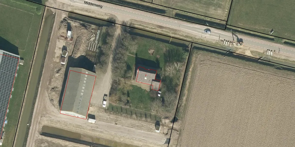 Het perceel waarop Middenweg 8 staat heeft een oppervlakte van 4,4 ha. Dit is een zeer groot perceel. De perceeloppervlakte wordt geregistreerd door het Kadaster. Gedetailleerde informatie over de maten van dit perceel kunt u vinden in het rapport Kadastrale kaart met maatvoering van Middenweg 8.