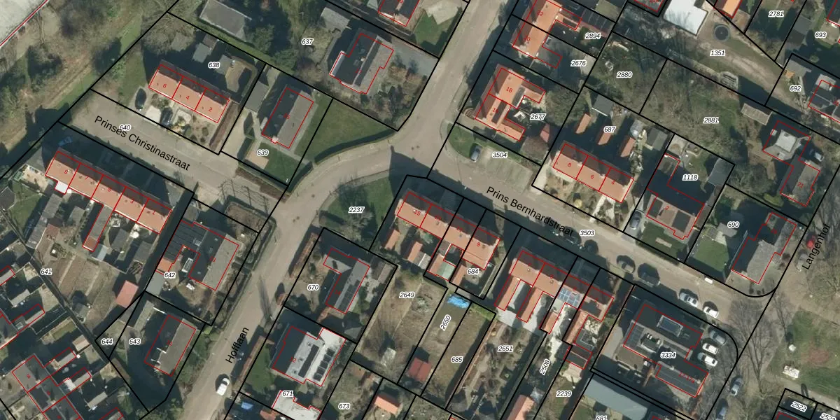 Het perceel waarop Prins Bernhardstraat 15 staat heeft een oppervlakte van 640 m². Dit is een groot perceel. De perceeloppervlakte wordt geregistreerd door het Kadaster. Gedetailleerde informatie over de maten van dit perceel kunt u vinden in het rapport Kadastrale kaart met maatvoering van Prins Bernhardstraat 15.