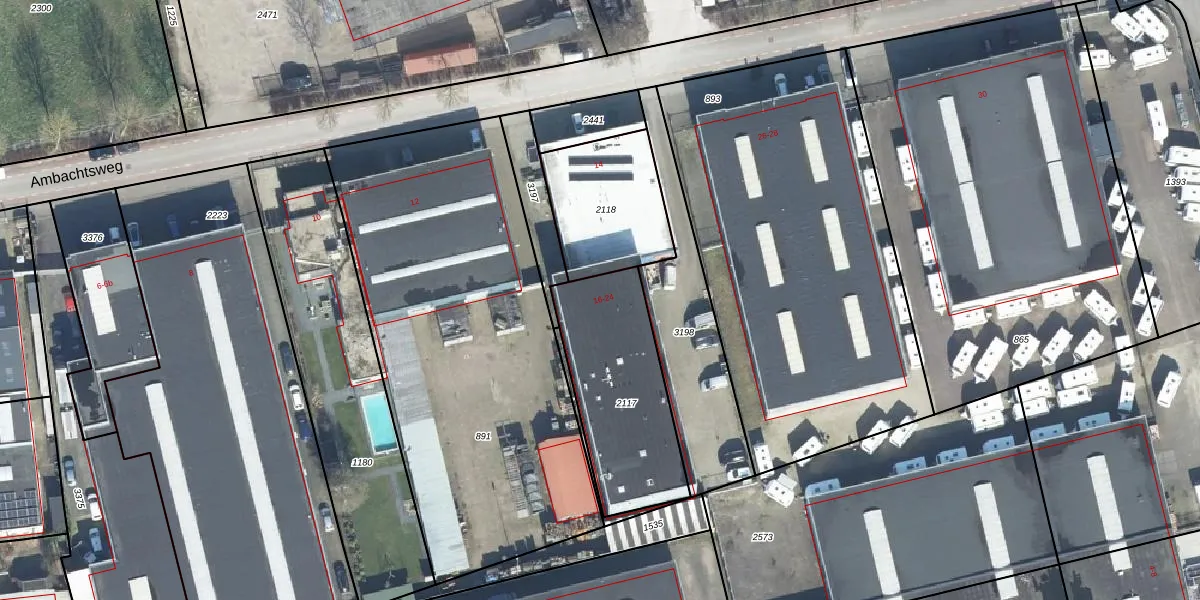 Het perceel waarop Ambachtsweg 16 staat heeft een oppervlakte van 593 m². Dit is een groot perceel. De perceeloppervlakte wordt geregistreerd door het Kadaster. Gedetailleerde informatie over de maten van dit perceel kunt u vinden in het rapport Kadastrale kaart met maatvoering van Ambachtsweg 16.