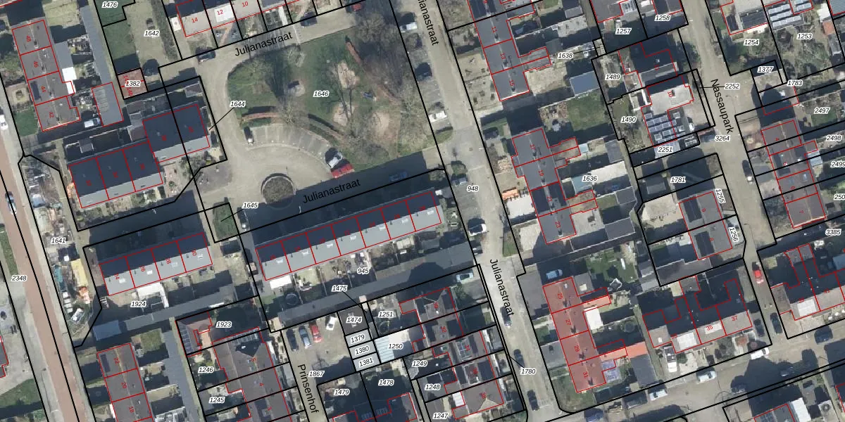 Het perceel waarop Julianastraat 28 staat heeft een oppervlakte van 1257 m². Dit is een zeer groot perceel. De perceeloppervlakte wordt geregistreerd door het Kadaster. Gedetailleerde informatie over de maten van dit perceel kunt u vinden in het rapport Kadastrale kaart met maatvoering van Julianastraat 28.