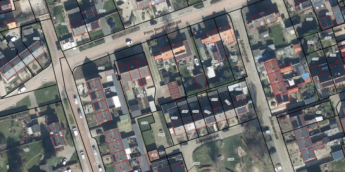 Het perceel waarop Prins Bernhardstraat 8-a staat heeft een oppervlakte van 3256 m². Dit is een zeer groot perceel. De perceeloppervlakte wordt geregistreerd door het Kadaster. Gedetailleerde informatie over de maten van dit perceel kunt u vinden in het rapport Kadastrale kaart met maatvoering van Prins Bernhardstraat 8-a.