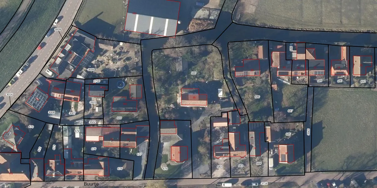 Het perceel waarop Buurtje 15 staat heeft een oppervlakte van 1775 m². Dit is een zeer groot perceel. De perceeloppervlakte wordt geregistreerd door het Kadaster. Gedetailleerde informatie over de maten van dit perceel kunt u vinden in het rapport Kadastrale kaart met maatvoering van Buurtje 15.
