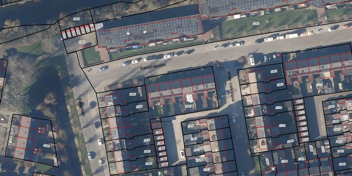 Het perceel waarop Keizerskroon 33 staat heeft een oppervlakte van 1308 m². Dit is een zeer groot perceel. De perceeloppervlakte wordt geregistreerd door het Kadaster. Gedetailleerde informatie over de maten van dit perceel kunt u vinden in het rapport Kadastrale kaart met maatvoering van Keizerskroon 33.