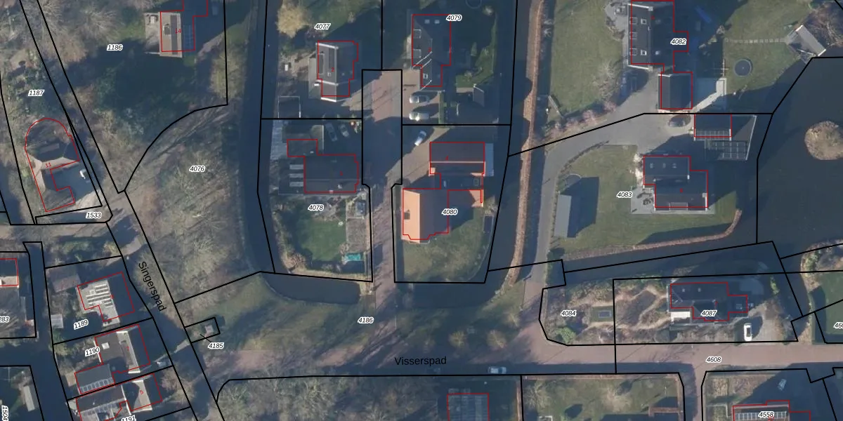Het perceel waarop Visserspad 4 staat heeft een oppervlakte van 915 m². Dit is een groot perceel. De perceeloppervlakte wordt geregistreerd door het Kadaster. Gedetailleerde informatie over de maten van dit perceel kunt u vinden in het rapport Kadastrale kaart met maatvoering van Visserspad 4.