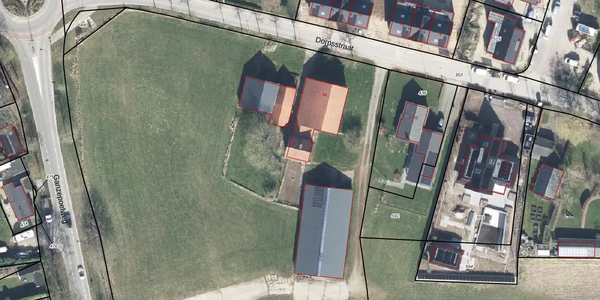 Het perceel waarop Dorpsstraat 54 staat heeft een oppervlakte van 3,3 ha. Dit is een zeer groot perceel. De perceeloppervlakte wordt geregistreerd door het Kadaster. Gedetailleerde informatie over de maten van dit perceel kunt u vinden in het rapport Kadastrale kaart met maatvoering van Dorpsstraat 54.