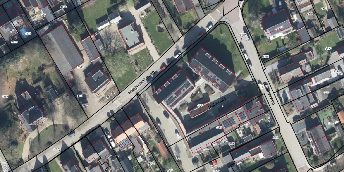 Het perceel waarop Molenveld 14 staat heeft een oppervlakte van 2655 m². Dit is een zeer groot perceel. De perceeloppervlakte wordt geregistreerd door het Kadaster. Gedetailleerde informatie over de maten van dit perceel kunt u vinden in het rapport Kadastrale kaart met maatvoering van Molenveld 14.