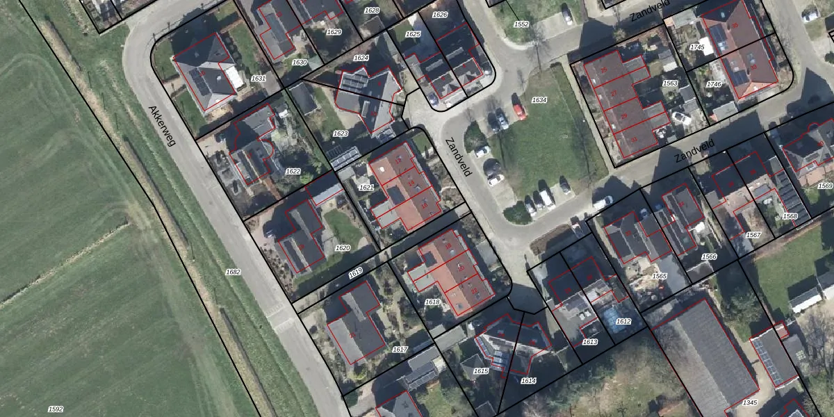 Zandveld 16 is gelegen op kadastraal perceel AGL00B1621. Deze kadastrale aanduiding is uniek en wordt gebruikt door het Kadaster om eigendomsrechten en andere zakelijke rechten vast te leggen. Het perceel maakt onderdeel uit van de kadastrale gemeente Angerlo.