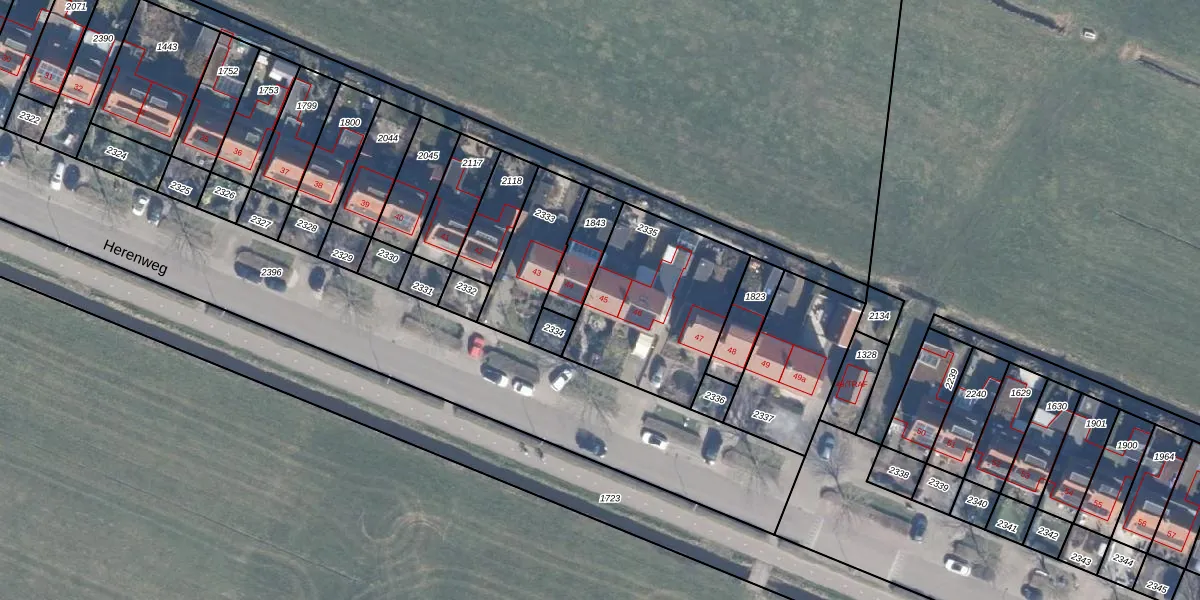 Het perceel waarop Herenweg 45 staat heeft een oppervlakte van 628 m². Dit is een groot perceel. De perceeloppervlakte wordt geregistreerd door het Kadaster. Gedetailleerde informatie over de maten van dit perceel kunt u vinden in het rapport Kadastrale kaart met maatvoering van Herenweg 45.