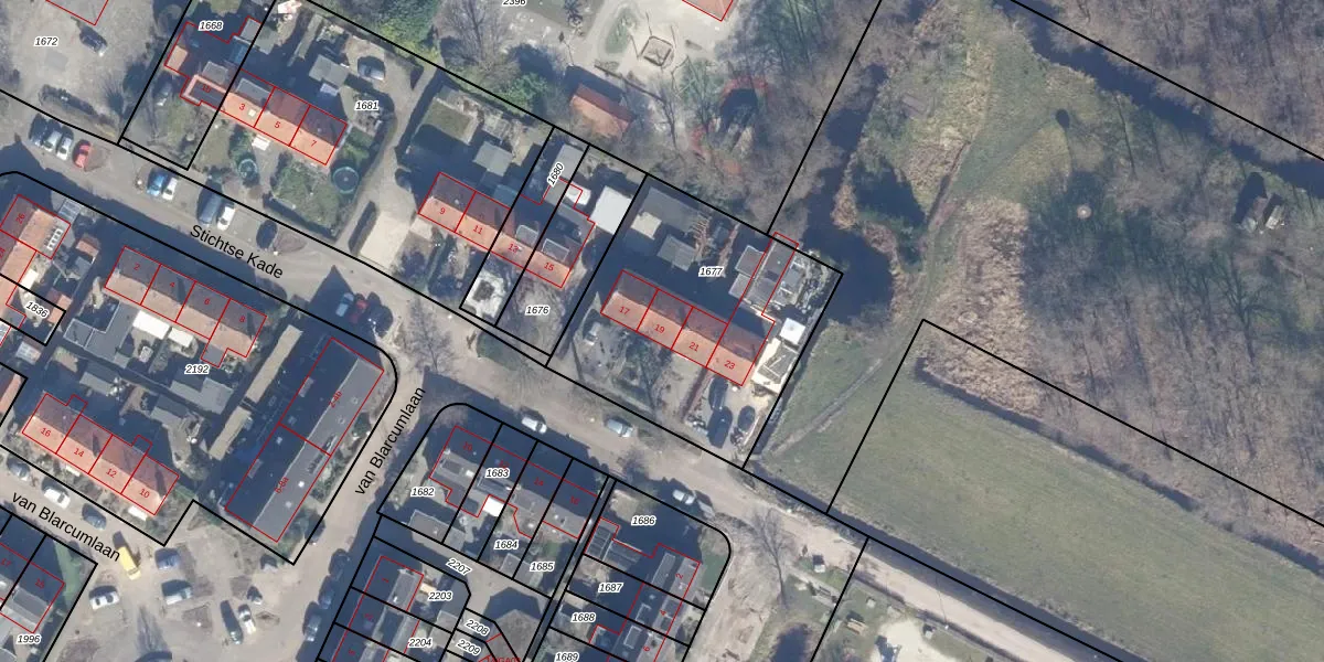 Het perceel waarop Stichtse Kade 19 staat heeft een oppervlakte van 1112 m². Dit is een zeer groot perceel. De perceeloppervlakte wordt geregistreerd door het Kadaster. Gedetailleerde informatie over de maten van dit perceel kunt u vinden in het rapport Kadastrale kaart met maatvoering van Stichtse Kade 19.