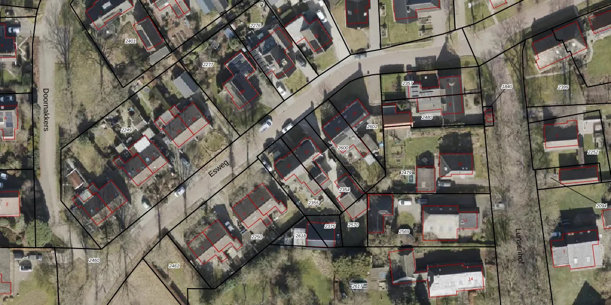 Esweg 12 is gelegen op kadastraal perceel ALO00K2354. Deze kadastrale aanduiding is uniek en wordt gebruikt door het Kadaster om eigendomsrechten en andere zakelijke rechten vast te leggen. Het perceel maakt onderdeel uit van de kadastrale gemeente Anloo.