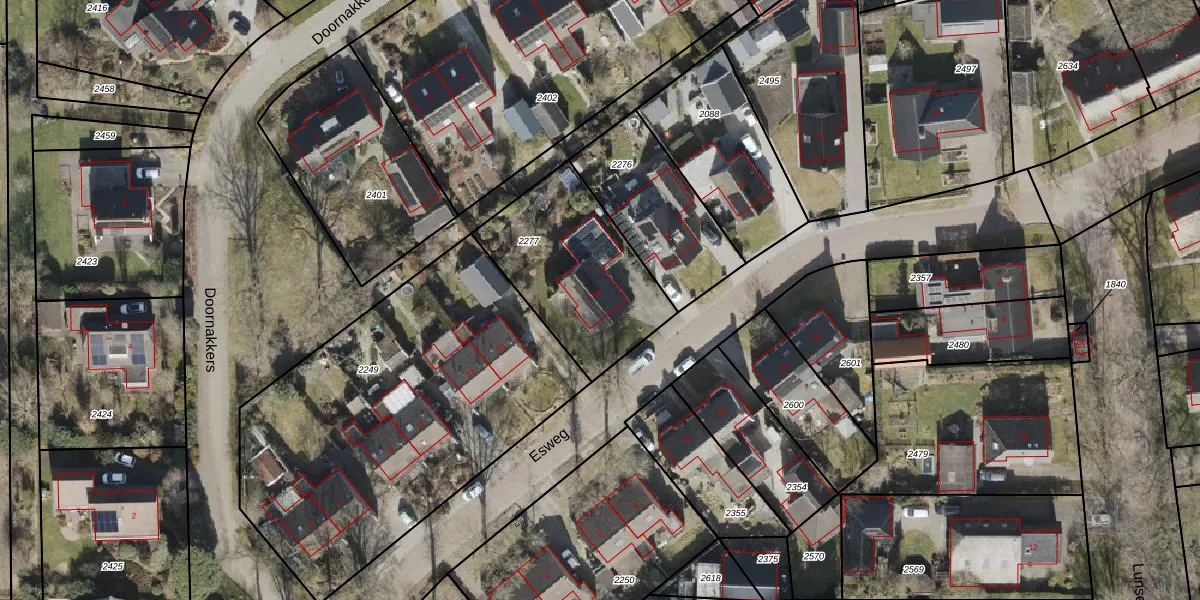 Het perceel waarop Esweg 15-a staat heeft een oppervlakte van 612 m². Dit is een groot perceel. De perceeloppervlakte wordt geregistreerd door het Kadaster. Gedetailleerde informatie over de maten van dit perceel kunt u vinden in het rapport Kadastrale kaart met maatvoering van Esweg 15-a.