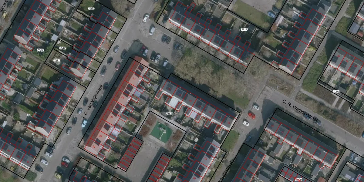 Het perceel waarop C. R. Waiboerstraat 25 staat heeft een oppervlakte van 5320 m². Dit is een zeer groot perceel. De perceeloppervlakte wordt geregistreerd door het Kadaster. Gedetailleerde informatie over de maten van dit perceel kunt u vinden in het rapport Kadastrale kaart met maatvoering van C. R. Waiboerstraat 25.