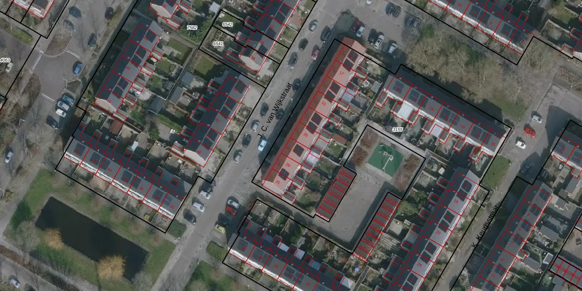 Het perceel waarop J. C. van Wijkstraat 27 staat heeft een oppervlakte van 5320 m². Dit is een zeer groot perceel. De perceeloppervlakte wordt geregistreerd door het Kadaster. Gedetailleerde informatie over de maten van dit perceel kunt u vinden in het rapport Kadastrale kaart met maatvoering van J. C. van Wijkstraat 27.