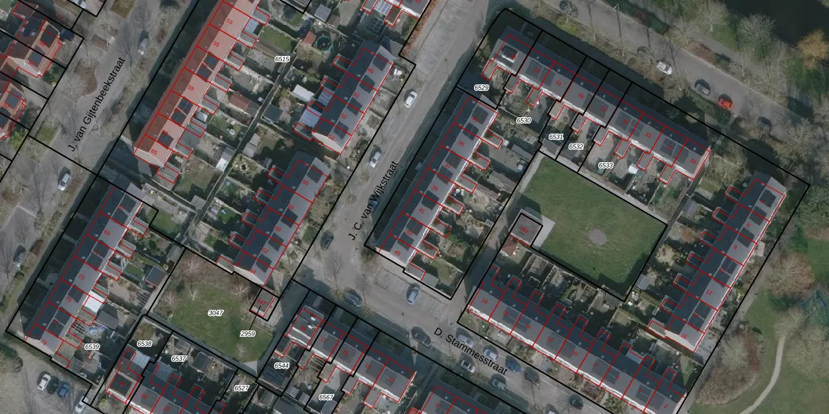 Het perceel waarop J. C. van Wijkstraat 41 staat heeft een oppervlakte van 1385 m². Dit is een zeer groot perceel. De perceeloppervlakte wordt geregistreerd door het Kadaster. Gedetailleerde informatie over de maten van dit perceel kunt u vinden in het rapport Kadastrale kaart met maatvoering van J. C. van Wijkstraat 41.