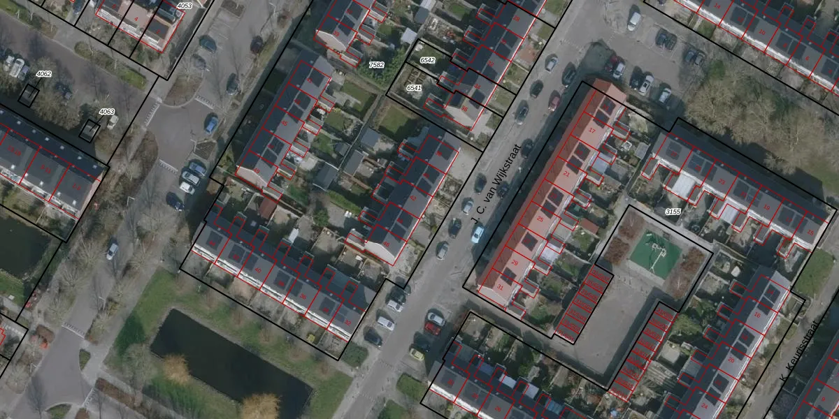Het perceel waarop J. C. van Wijkstraat 42 staat heeft een oppervlakte van 4678 m². Dit is een zeer groot perceel. De perceeloppervlakte wordt geregistreerd door het Kadaster. Gedetailleerde informatie over de maten van dit perceel kunt u vinden in het rapport Kadastrale kaart met maatvoering van J. C. van Wijkstraat 42.