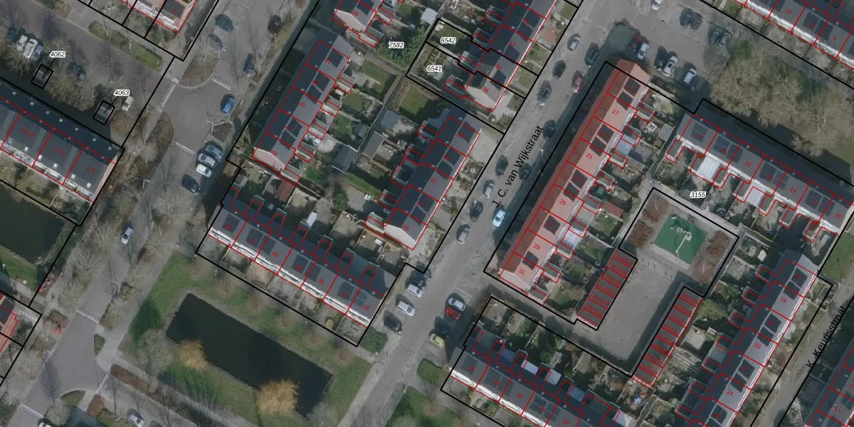 Het perceel waarop J. C. van Wijkstraat 44 staat heeft een oppervlakte van 4678 m². Dit is een zeer groot perceel. De perceeloppervlakte wordt geregistreerd door het Kadaster. Gedetailleerde informatie over de maten van dit perceel kunt u vinden in het rapport Kadastrale kaart met maatvoering van J. C. van Wijkstraat 44.