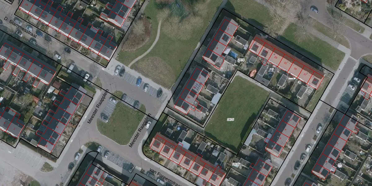 Het perceel waarop Meester Raapplein 13 staat heeft een oppervlakte van 2525 m². Dit is een zeer groot perceel. De perceeloppervlakte wordt geregistreerd door het Kadaster. Gedetailleerde informatie over de maten van dit perceel kunt u vinden in het rapport Kadastrale kaart met maatvoering van Meester Raapplein 13.
