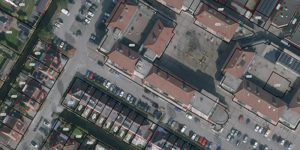Het perceel waarop Molengang 122 staat heeft een oppervlakte van 2640 m². Dit is een zeer groot perceel. De perceeloppervlakte wordt geregistreerd door het Kadaster. Gedetailleerde informatie over de maten van dit perceel kunt u vinden in het rapport Kadastrale kaart met maatvoering van Molengang 122.