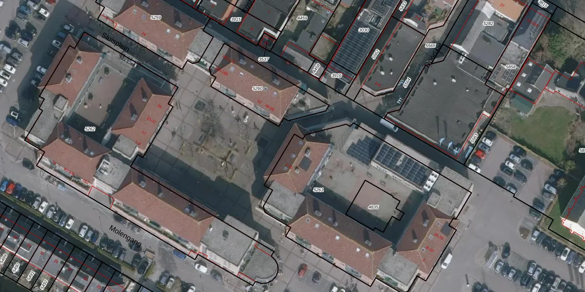 Het perceel waarop Sluisplein 8 staat heeft een oppervlakte van 2450 m². Dit is een zeer groot perceel. De perceeloppervlakte wordt geregistreerd door het Kadaster. Gedetailleerde informatie over de maten van dit perceel kunt u vinden in het rapport Kadastrale kaart met maatvoering van Sluisplein 8.