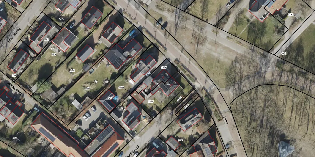 Het perceel waarop Brink 12 staat heeft een oppervlakte van 245 m². Dit is een middelgroot perceel. De perceeloppervlakte wordt geregistreerd door het Kadaster. Gedetailleerde informatie over de maten van dit perceel kunt u vinden in het rapport Kadastrale kaart met maatvoering van Brink 12.