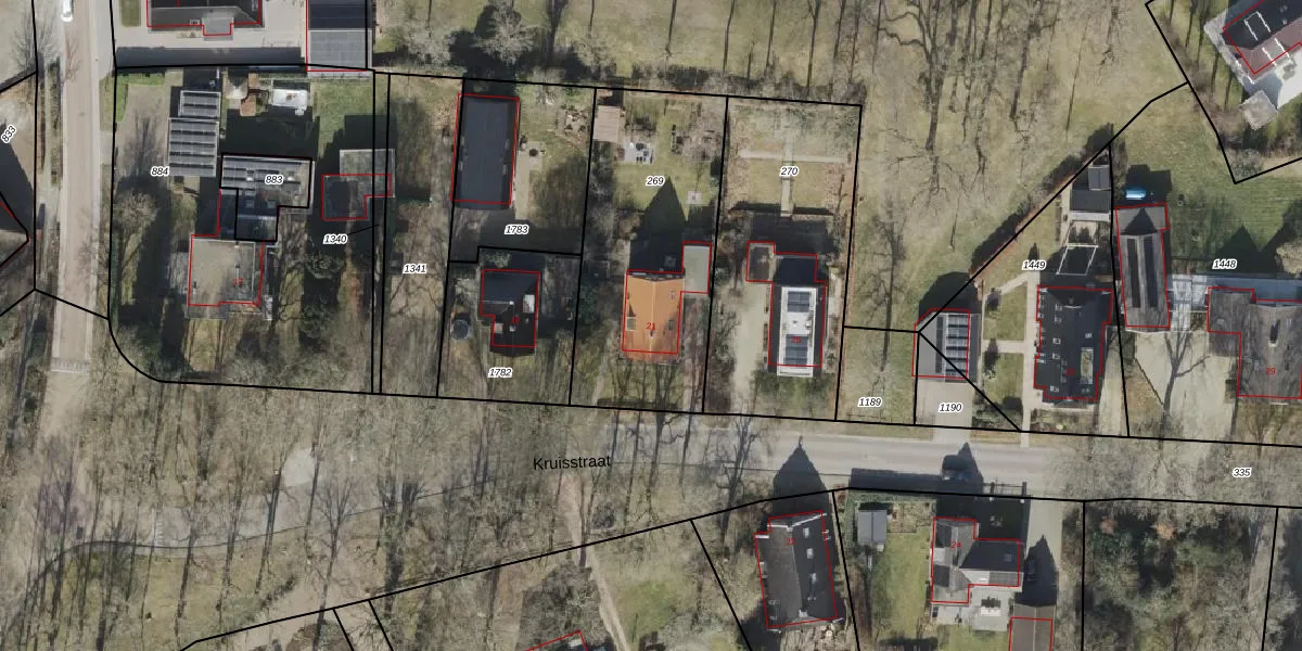 Het perceel waarop Kruisstraat 21 staat heeft een oppervlakte van 996 m². Dit is een groot perceel. De perceeloppervlakte wordt geregistreerd door het Kadaster. Gedetailleerde informatie over de maten van dit perceel kunt u vinden in het rapport Kadastrale kaart met maatvoering van Kruisstraat 21.