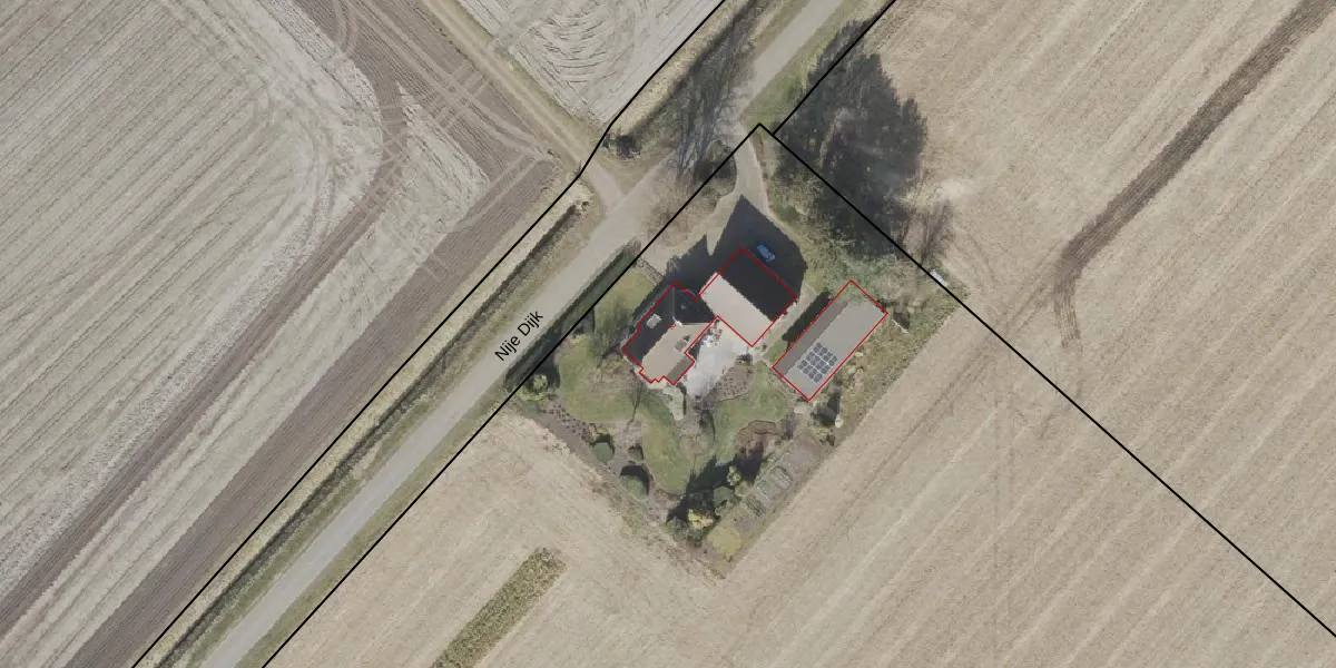 Het perceel waarop Nije Dijk 2 staat heeft een oppervlakte van 1,9 ha. Dit is een zeer groot perceel. De perceeloppervlakte wordt geregistreerd door het Kadaster. Gedetailleerde informatie over de maten van dit perceel kunt u vinden in het rapport Kadastrale kaart met maatvoering van Nije Dijk 2.