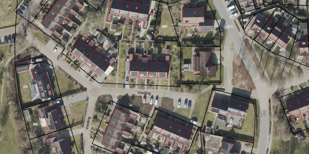 Het perceel waarop Vreding 29 staat heeft een oppervlakte van 4036 m². Dit is een zeer groot perceel. De perceeloppervlakte wordt geregistreerd door het Kadaster. Gedetailleerde informatie over de maten van dit perceel kunt u vinden in het rapport Kadastrale kaart met maatvoering van Vreding 29.