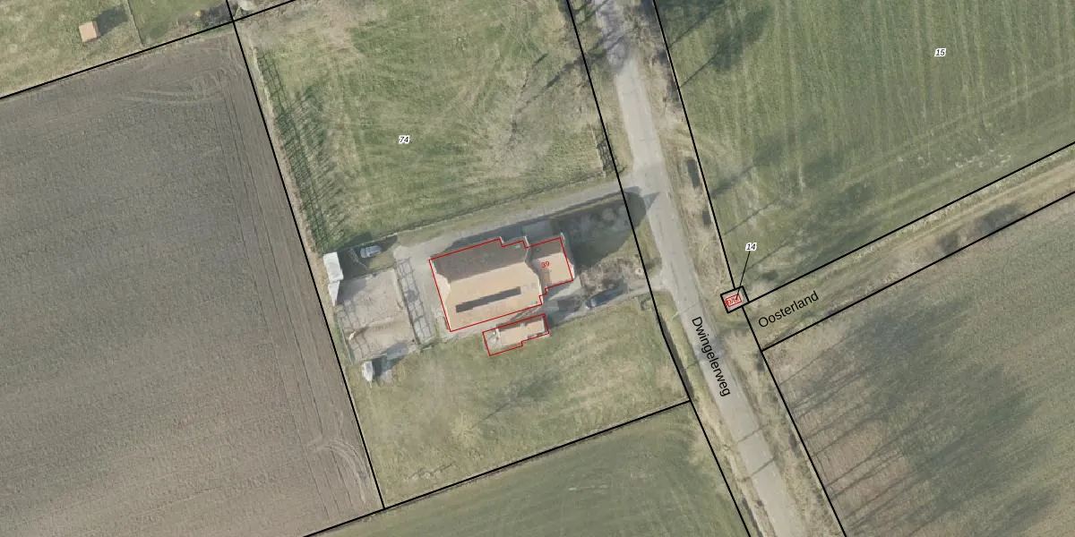 Dwingelerweg 39 is gelegen op kadastraal perceel RNN02I74. Deze kadastrale aanduiding is uniek en wordt gebruikt door het Kadaster om eigendomsrechten en andere zakelijke rechten vast te leggen. Het perceel maakt onderdeel uit van de kadastrale gemeente Ruinen.