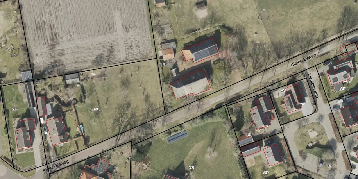 Het perceel waarop Kleine Esweg 7 staat heeft een oppervlakte van 9750 m². Dit is een zeer groot perceel. De perceeloppervlakte wordt geregistreerd door het Kadaster. Gedetailleerde informatie over de maten van dit perceel kunt u vinden in het rapport Kadastrale kaart met maatvoering van Kleine Esweg 7.