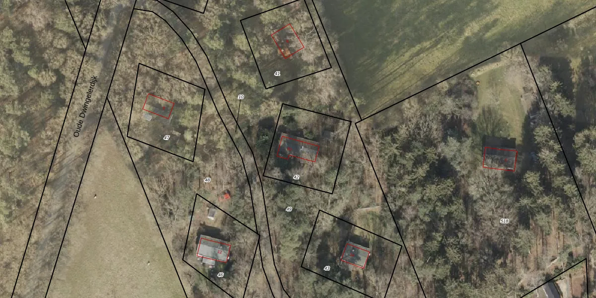 Oude Dwingelerdijk 10 is gelegen op kadastraal perceel RNN02I42. Deze kadastrale aanduiding is uniek en wordt gebruikt door het Kadaster om eigendomsrechten en andere zakelijke rechten vast te leggen. Het perceel maakt onderdeel uit van de kadastrale gemeente Ruinen.