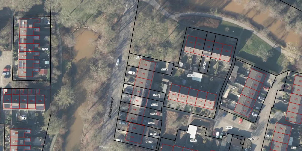 Het perceel waarop Barnewinkel 102 staat heeft een oppervlakte van 2087 m². Dit is een zeer groot perceel. De perceeloppervlakte wordt geregistreerd door het Kadaster. Gedetailleerde informatie over de maten van dit perceel kunt u vinden in het rapport Kadastrale kaart met maatvoering van Barnewinkel 102.