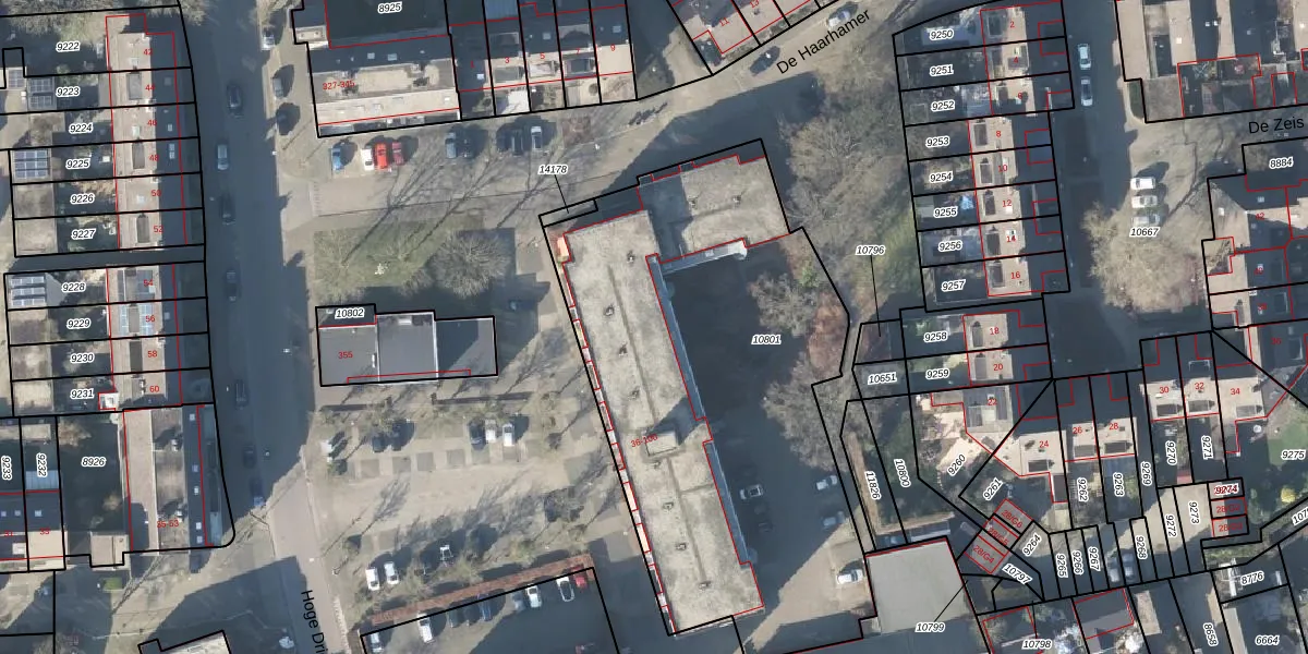 Het perceel waarop De Haarhamer 88 staat heeft een oppervlakte van 2555 m². Dit is een zeer groot perceel. De perceeloppervlakte wordt geregistreerd door het Kadaster. Gedetailleerde informatie over de maten van dit perceel kunt u vinden in het rapport Kadastrale kaart met maatvoering van De Haarhamer 88.